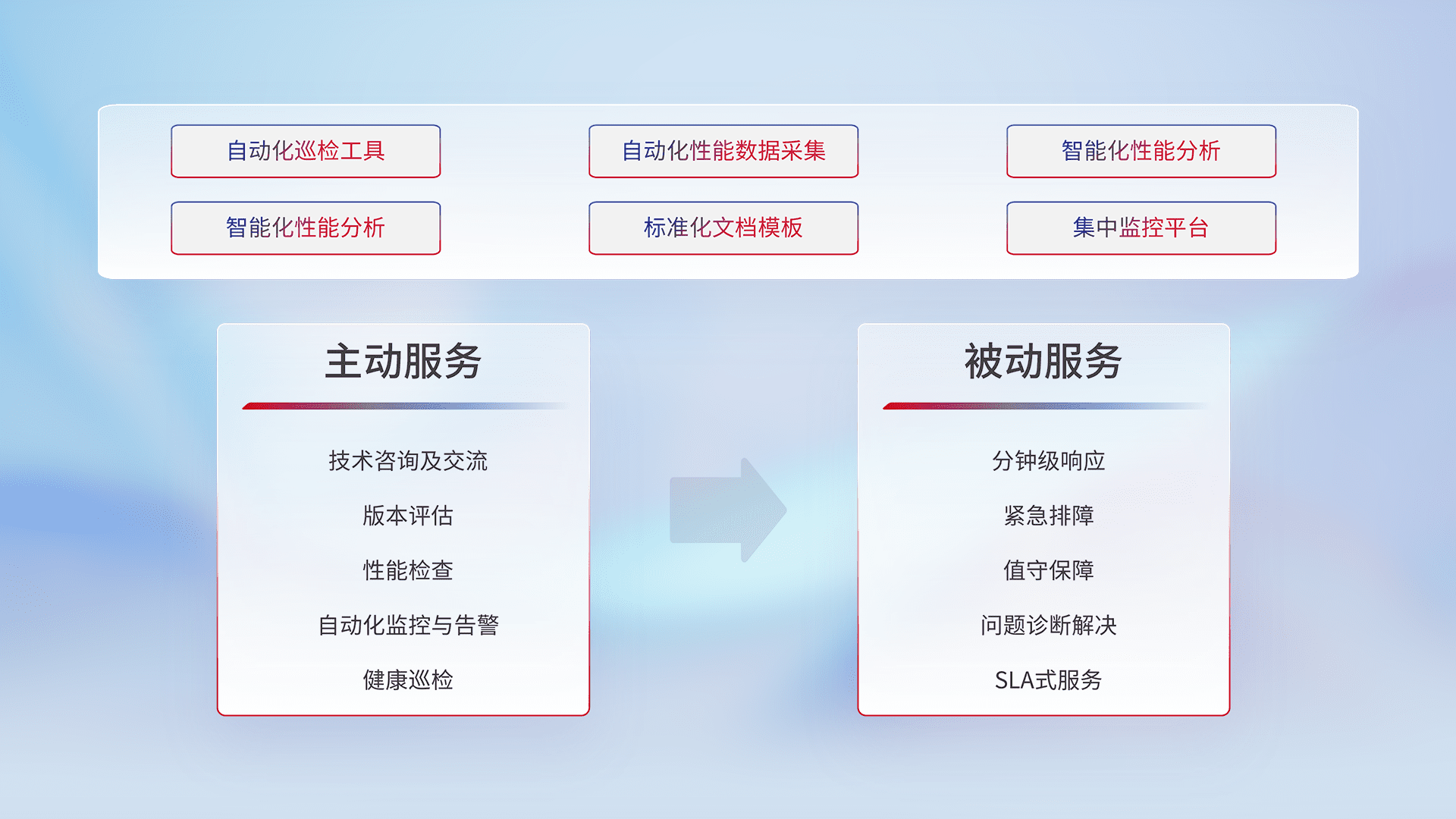 智能化工具和标准化文档,,,,保障服务质量,,,提供主动服务(包含技术咨询、、、版本评估、、、性能检查、、、、自动化监控与告警、、、健康巡检)和被动服务包含(分钟级响应、、紧急排障、、、值守保障、、、、问题诊断解决、、、、SLA服务)。。